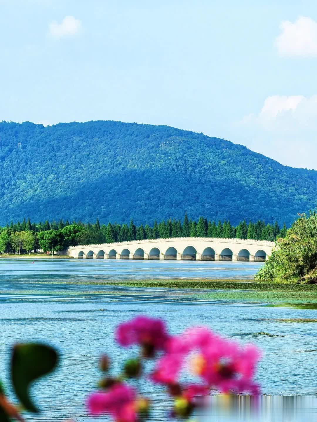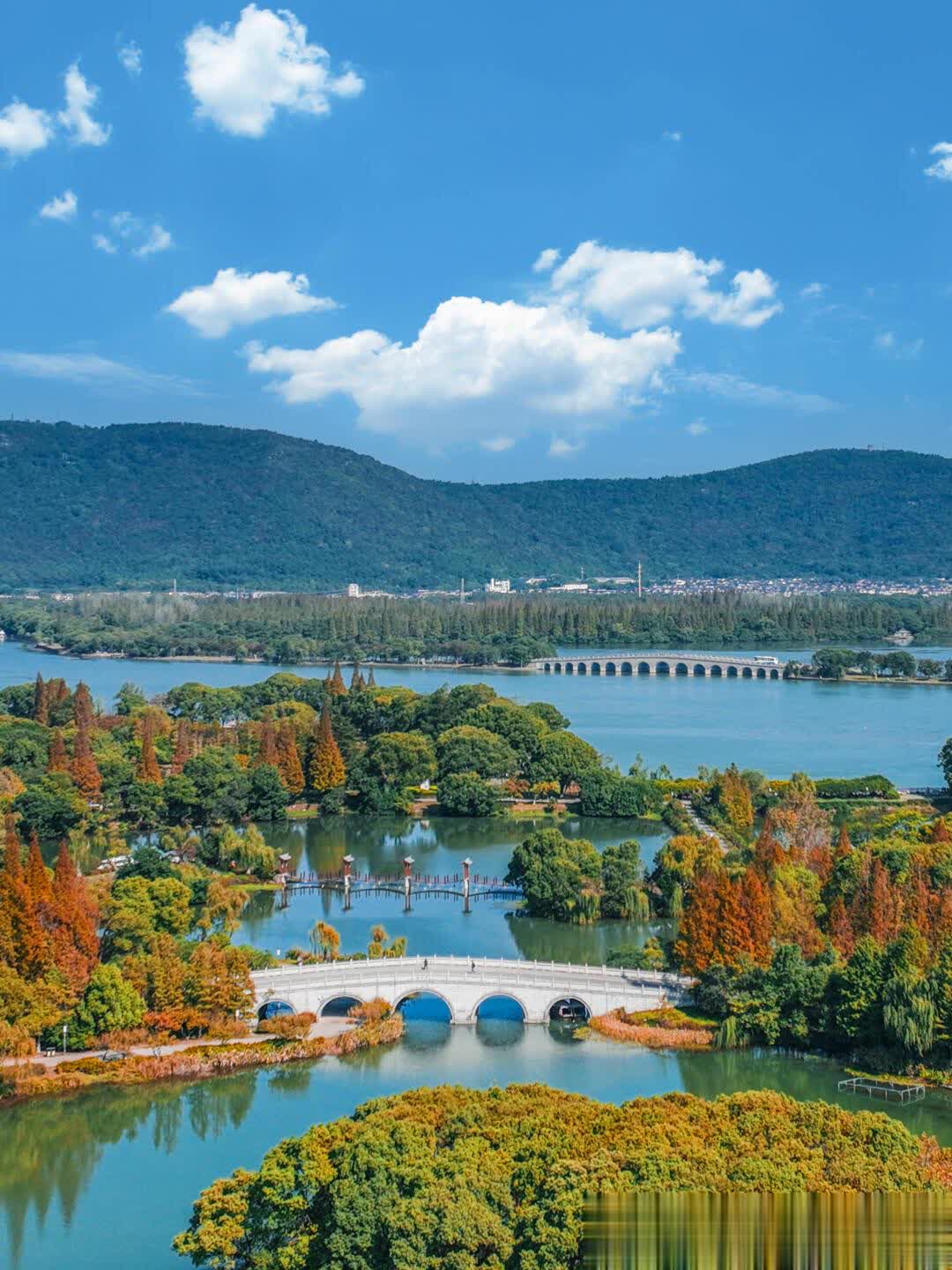 曾认为西湖的好意思已无可相比,直到相见了常熟的尚湖,才显然什么叫“别有洞天,湖外有湖”。尚湖的好意思,是一种交融了山水之秀与园林之雅的特有韵味,既有琼枝玉叶的在意,又不失掌上明珠的灵动。湖面水光潋滟,微风拂过,泛起层层涟漪。辽远的山峦反照其中,山水相依,如归拢幅自然的水墨画。沿着湖上长桥溜达,仿佛在画中穿行;走进林中小路,曲径通幽,仿佛跻身于瑶池。