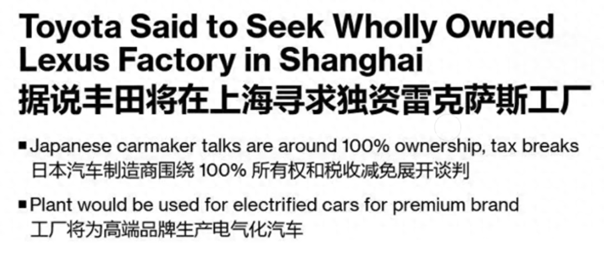 据多家巨擘媒体报说念,丰田汽车正积极与上海当局接洽建立独资雷克萨斯工场的可能性。雷克萨斯工场将专注于高端电动汽车的分娩,丰田但愿获取与特斯拉相似的待遇,包括税收减免、政策支援、地皮缓助等优惠政策。重心是,丰田对持100%独资控股,拒却原土结伴,意图十足掌控工场的分娩运营。
