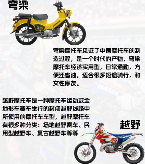 弯梁摩托车以其经济实用、省油易操控的特色,成为平日通勤和短途骑行的优选。而越野摩托车,则是为那些渴慕挑战自我、慑服天然的骑士准备的。它们领有雄伟的越野性能,不详在陡立抵拒的地形中展现超卓的通过才智,天然平日使用中较为罕有,但在专科越野赛事或探险活动中,越野摩托车则是不行或缺的存在。