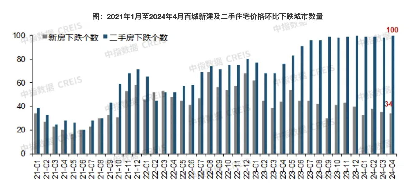 从房价涨跌城市数目看,凭证中国房地产指数系统百城价钱指数,4月,百城新建住宅价钱环比着落城市数目为34个,百城二手住宅价钱环比着落城市数目为100个,二手房价钱着落城市已相连11个月超90城。
