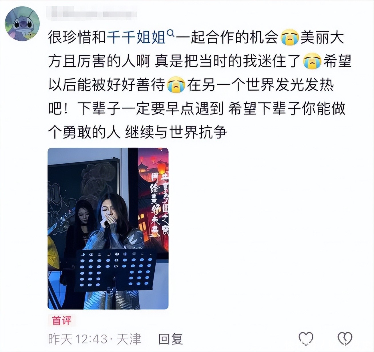 此前与千千一同协作过的伙伴也在指摘区给以操心,不错得知在周围东说念主眼里,千千脾性关心大方,东说念主格魔力十分出众,与其构兵过的东说念主王人会被她所迷惑,缺憾的是天妒朱颜,这样好意思好的女孩子东说念主生却如同烟花一般灿艳俄顷。