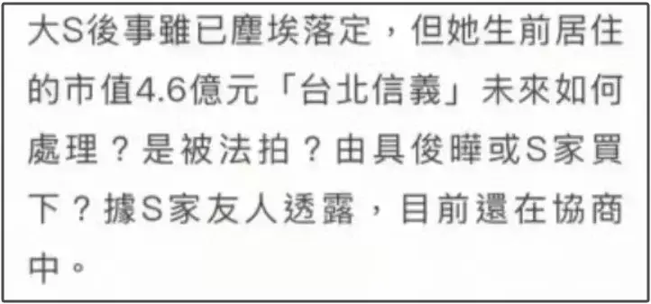 大S去世后,台媒及亲一又屡次对外放话要汪小菲毁掉争遗产(包括房产)的心念念。由此可见,大S遗产中房产占有较大比重,其中最瞩见识是大S生前居住的4.6亿台币(约1亿东说念主民币)的台北豪宅,这套屋子之前是汪小菲还贷,断供后大S经济压力倍增,还因为借债还贷跟S妈链接闹僵。据S家亲一又透露,这套房到底是法拍如故由具俊晔或S家东说念主购买仍未有定论,还在协商。