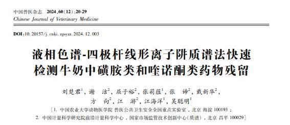 参考贵府[1]刘楚君,谢洁,屈子裕赌钱赚钱软件官方登录,等.液相色谱-四极杆线形离子阱质谱法快速检测牛奶中磺胺类和喹诺酮类药物残留[J].中国兽医杂志,2024,